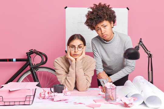 Unhappy diverse female classmates engeneering or training pose in coworking space make plannings for startup prepares architectural blueprints draw sketches prepare for brainstrorming session