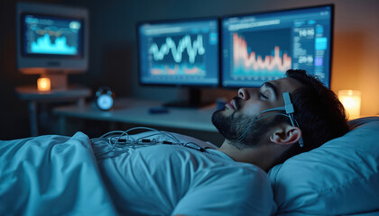 Man sleeps in bed connected to sleep monitoring equipment. Monitors display brainwave graphs. Research for sleep disorders and health analysis.