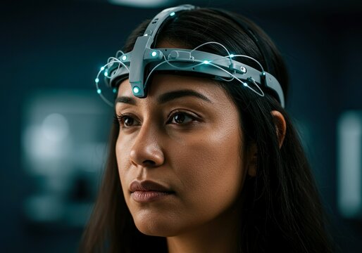 Woman in futuristic attire wearing a brainwave sensor, meditating with eyes closed. Concept innovation, technology, mindfulness, AI, future, wellness. Use for tech, health, or lifestyle visuals.