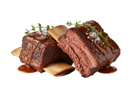 Two exquisitely braised beef short ribs, tender, glossy demi-glace, garnished with thyme and sea salt, isolated on a transparent background with studio lighting. Concept of gourmet culinary excellence