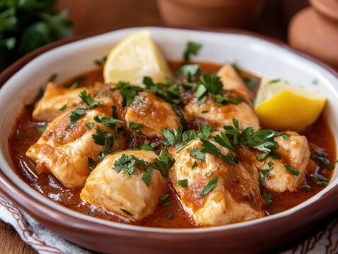 Delicious chicken cubes braised in spicy tomato sauce served in a bowl with lemon garnish