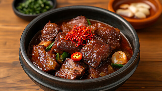 Bowl of braised short ribs stew with red chili pepper garnish and green onions. This Korean dish called Galbi-jjim, perfect for cold weather.