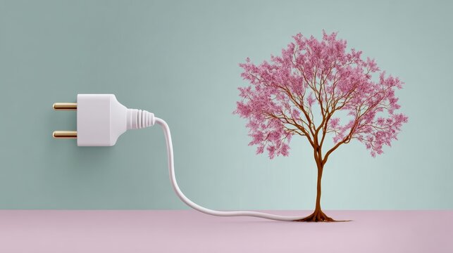 Artistic illustration of a pink flowering tree connected to a white electrical plug, symbolizing the fusion of nature and technology, with a soft pastel background enhancing the visual impact