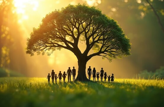 Family stands under big tree in green field. Image represents connection roots genealogy heritage. Concept shows generations bond and relationships under sunlight.