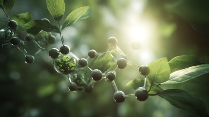 Artistic depiction of interconnected molecular structure merging with natural foliage