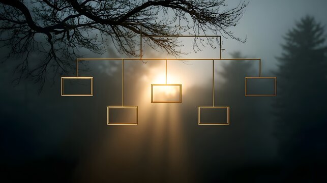 Mysterious golden frames form an organization chart hanging from a bare tree branch in a foggy forest during sunrise with light rays