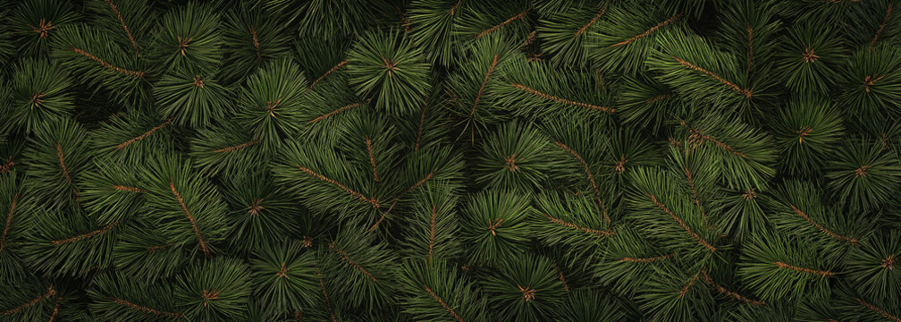 Green pine tree branches seamless pattern background. Top view, flat lay.