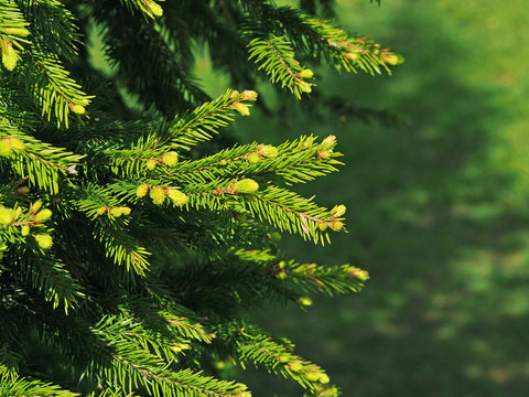 Young fir buds. Spring landscape in green tones. Sprouts spruce