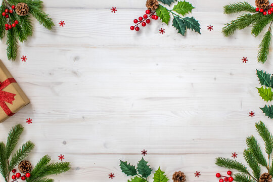 Christmas composition with gifts, mistletoe, pine cones, fir branches and snowflakes on a light wood background