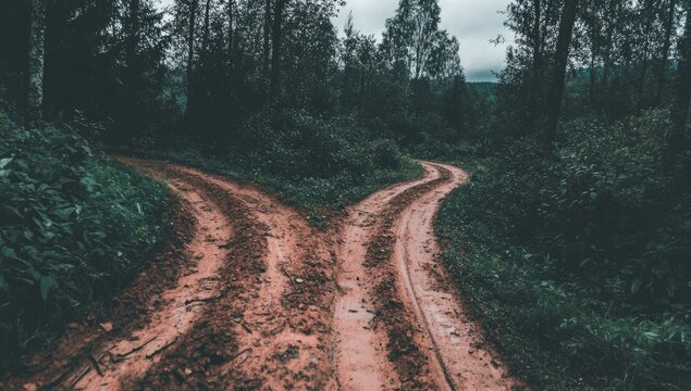 Fork in two directions. Critical decision point or a crossroads , where choosing between two distinct paths, each leading to different outcomes and destinations. Visual metaphor.