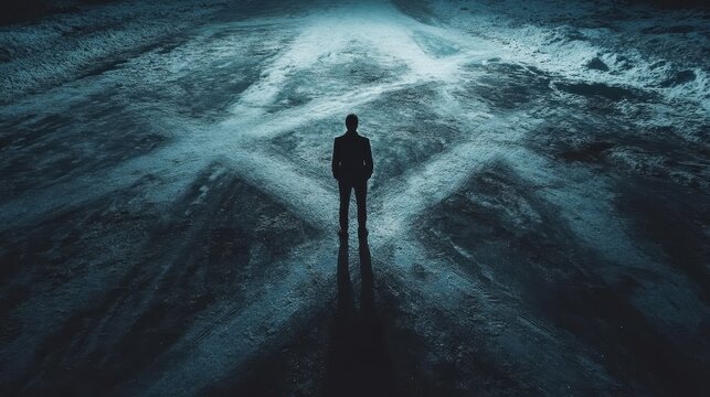 A person standing at a crossroads, with multiple paths branching out, each representing different possibilities and decisions