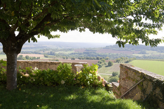 View on the Vezelay hill with a branchy tree. The Vezelay hill is located in the Yonne province in Burgundy, France.