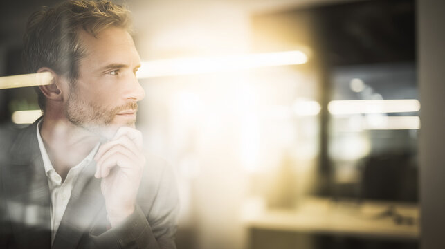 leader. A business professional in a modern office contemplating digital concepts thoughtfully. pitch deck slides, case study pages, designed for brand storytelling and e-commerce strategy.