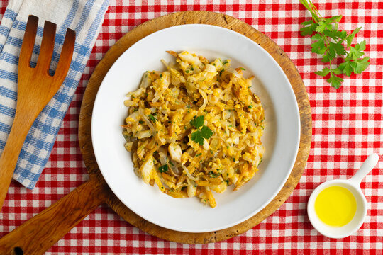Cod o bras, golden cod with potatoes, a traditional Portuguese dish. Top view table.