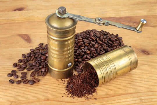 an unglazed pottery bowl filled with parchment coffee beans next to a brass manual coffee grinder, with coffee grounds spilling out from the grinder's exit.