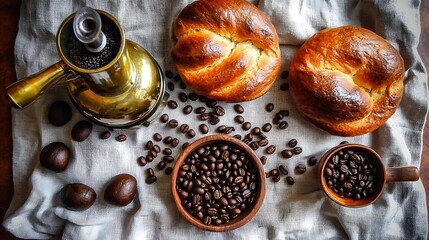 Cozy overhead composition of fresh baked goods, vintage brass coffee grinder, and coffee beans on textured linen, warm light enhancing rustic feel