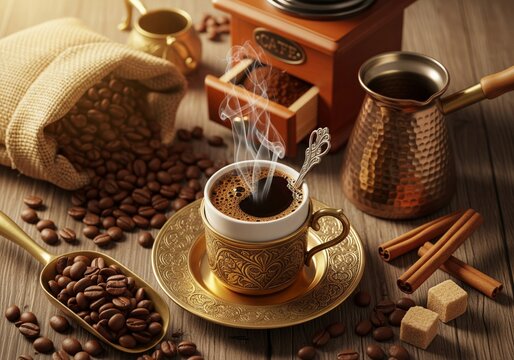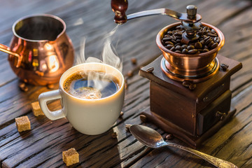 Coffee still-life. Hot cup of coffee and old-fashioned coffee grinder and cezve.