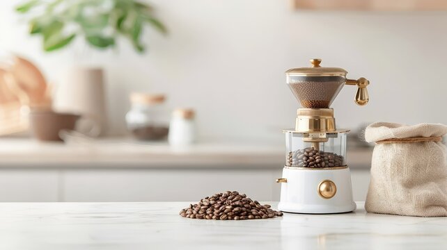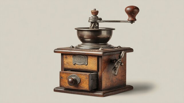 Antique Coffee Grinder: A classic antique coffee grinder stands proudly on a vintage wooden table, set against the warm light filtering through a nearby window.