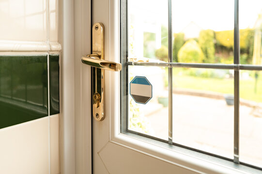 Shallow focus of a newly installed double glazed kitchen door, looking out to the large private garden in late spring.