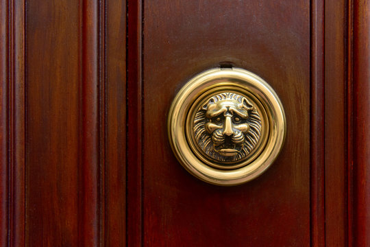 Vintage antique door knocker in the form of the head of a lion with ring on the old orange brown wooden door. Decorative element on weathered wood surface. Architecture in Italy . Details of entrance.