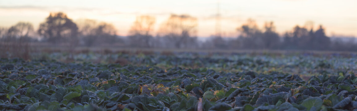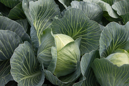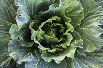 Closeup of fresh green cabbage growing in an agricultural field of West Bengal.