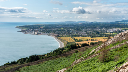 Summer coastal landscape as seen from the Bray Head Cliff Walk offering stunning views over the Irish Sea and the lovely countryside in Ireland on a sunny day.