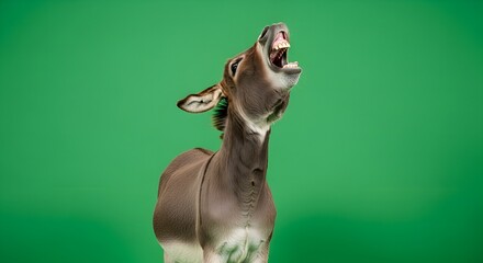 Cute Donkey Braying with Open Mouth on Bright Green Background
