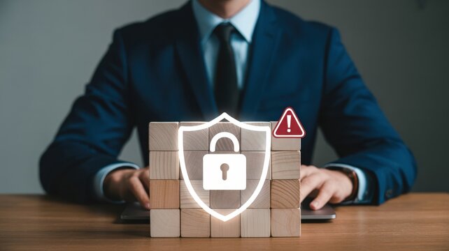 Cyber Security - A businessman's hands on a laptop, with a glowing shield and padlock icon and a warning sign, symbolizing a security breach