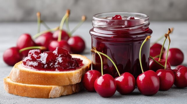 Breakfast Jam and bread on a marble table and next to a modern bakery