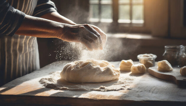 Woman in red dress and apron is preparing a dough for delicious homemade pink pasta on her kitchen. Dark and moody, low key. Green background. Italy, Tuscany. Banner