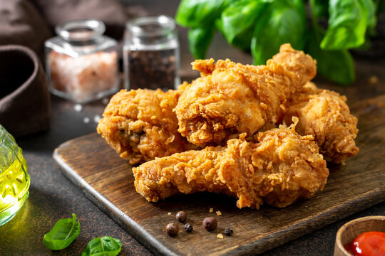 Fried crispy chicken legs in breadcrumbs on a wooden serving board on a dark background. Fast food from the drumstick close-up