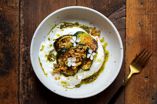 Burrata with pesto, grilled courgettes, crispy garlic breadcrumbs and radish flowers
