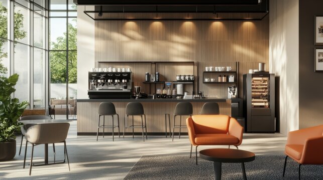 Elegant coffee break area in a modern office with minimal decor and sleek furniture professionals relaxing with coffee mugs natural light streaming in