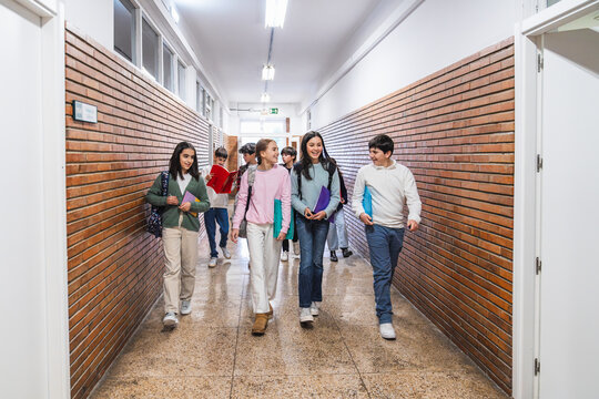 Smiling students carrying folders walk together down a bustling school hallway, enjoying their break between classes and sharing laughter