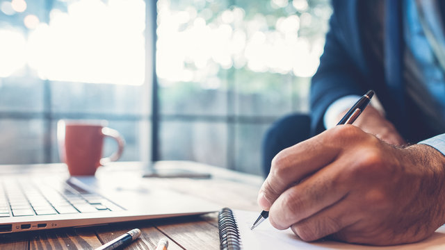 Successful business man. Corporate lifestyle. Powerful leader working at modern office. Closeup of male hand taking notes.