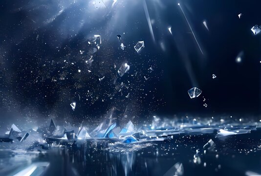 暗闇の中 砕けたガラスの破片と粒に差し込む光