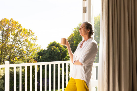 Mature woman practicing yoga at home, taking a moment to hydrate and reflect in a serene, green-filled space