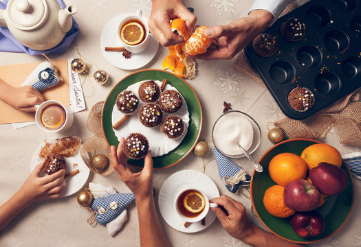 Advent time. Family tea party with homemade muffins