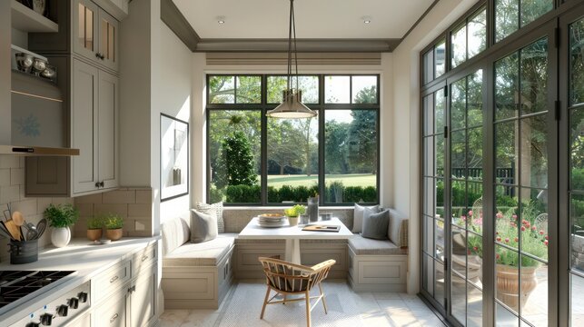A bright and minimalist kitchen featuring a cozy breakfast nook with a wooden table and chairs bathed in natural light from a large window.