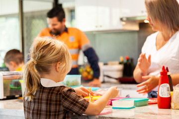 A family gathers around the table to organize a nutritious breakfast, ensuring children are ready for their school day.