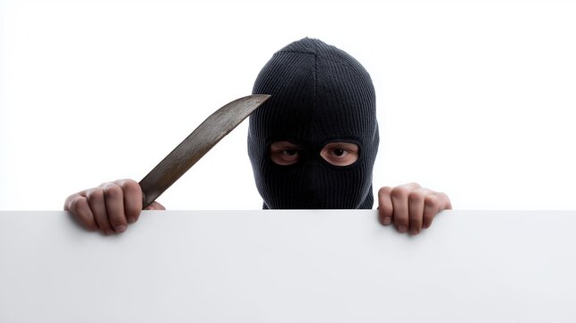a photo of a thief wearing a black balaclava on their face and holding a small crowbar, peeking behind a white banner, isolated on a white background.