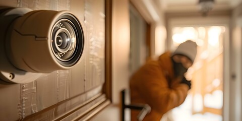 close-up of a thief wearing a black balaclava mask and gloves, breaking into a home. the white door has a brass handle, and the thief is holding lockpicks.