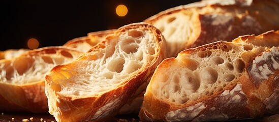 Close-up of a loaf of bread with a bite taken out, alongside slices of baguette for breakfast with copy space