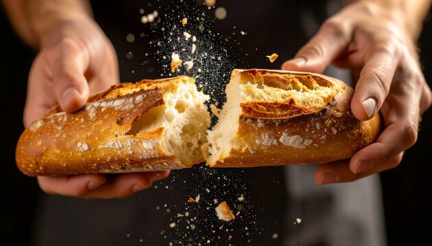 Hands holding fresh baguette wrapped in paper at bakery counter