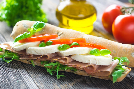 Crispy bacon and fresh vegetable baguette sandwich featuring cucumber, onion, parsley