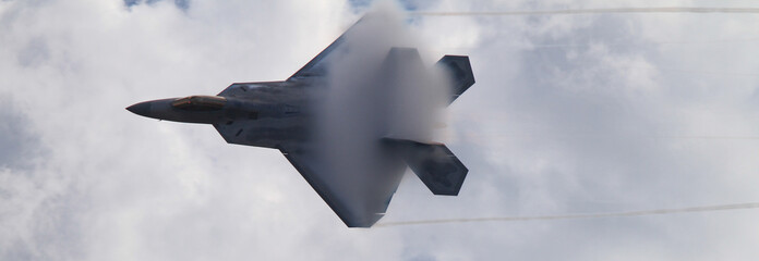 Jet airplane breaking the sound barrier generating a huge puff of clouds.
