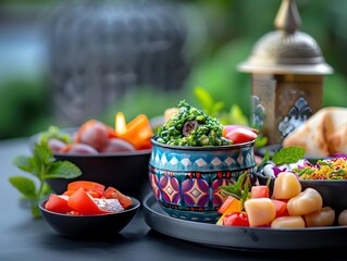 Arabic food is served on a table at sunset, creating a warm, inviting atmosphere for a festive meal during ramadan