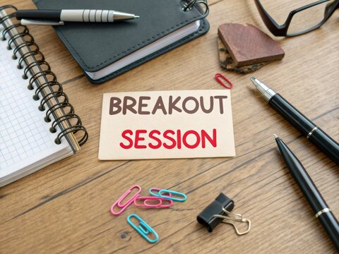 Torn yellow paper spelling 'BREAKOUT SESSION' nearest with Light Bulb Icon arranged neatly on a dark desk, beside a book and a sleek pen for writing
