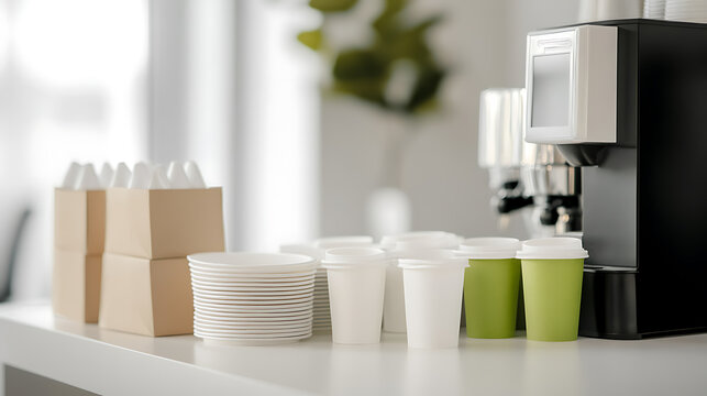 Coffee break station: dispenser with paper cups, lids, and napkins for refreshments. Minimalist setup, ideal for offices or events. Neutral colors, clean design.