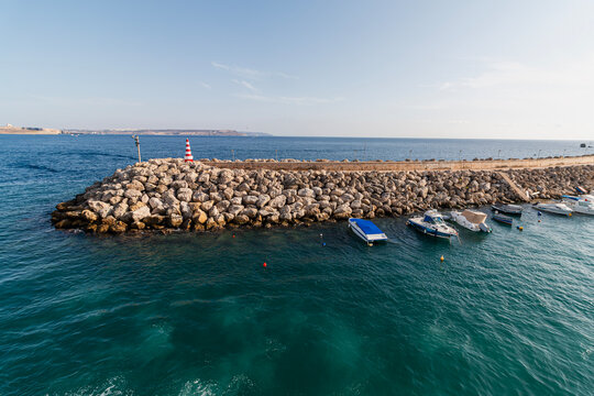 A rocky breakwater with a striped lighthouse extends into the vibrant blue sea, protecting several moored boats under a clear sky.